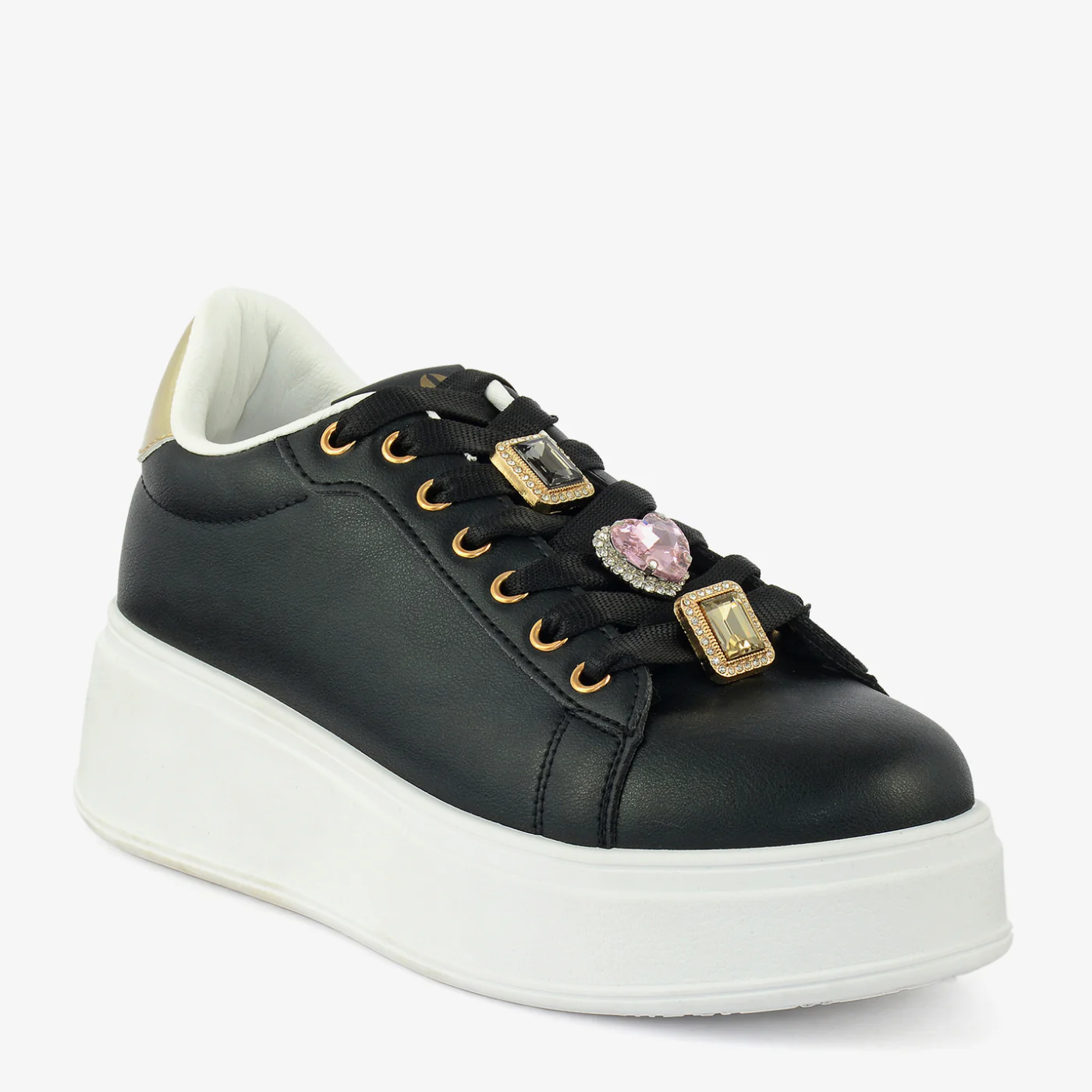 Command attention with the Metro Glam Platform Sneakers, where urban edge meets sophisticated styling. The sleek black synthetic leather upper is accentuated by striking gold details and a bold platform sole that elevates both your height and your style. Perfect for creating fashion-forward looks, these sneakers deliver confidence and comfort with every step.